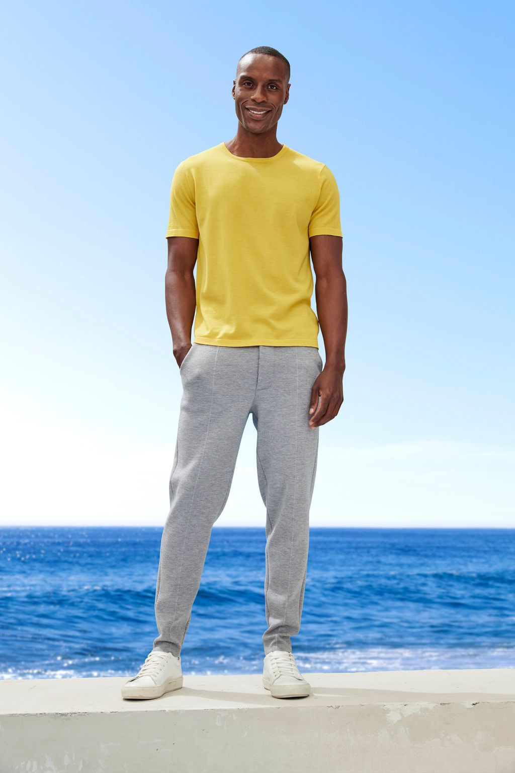 The summery T-shirt is knitted from ultrafine merino wool. The very fine jersey knit ensures that the T-shirt is extremely light and soft. Merino wool is breathable and temperature-regulating, providing optimum quality even during summer. French shoulder seams and a finely ribbed neckline round off the timeless, sporty classic look.