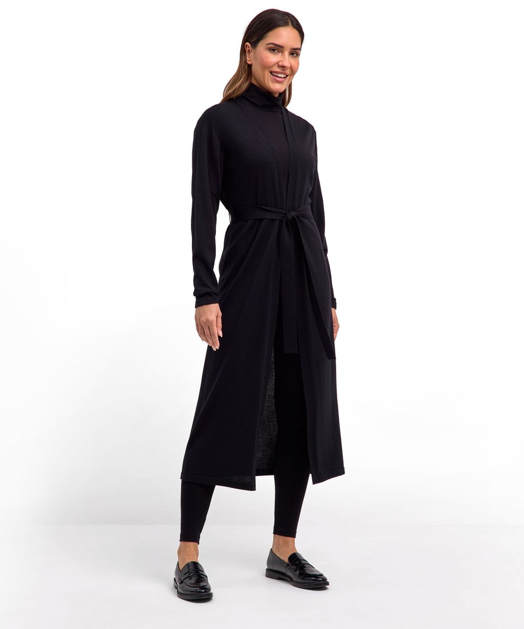 The classic, long cardigan is knitted from extra fine merino wool. The fine jersey knit is soft and easy to care for. French shoulder seams and a finely ribbed torso and cuffs complete the classic look. Thanks to the tie belt, the cardigan can be combined in many ways.